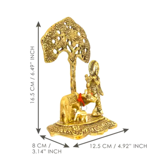 Lord Krishna playing Flute under Tree with Golden Cow and Calf Decorative Showpiece
